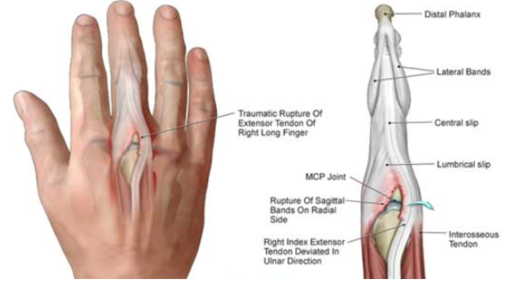 ⚑ 시상대파열(Sagittal band rupture)은 손가락 중수지절 관절에서 신전건을 고정하는 시상대가 파열되어 신전건이 중앙에서 벗어나며, 주로 외상이나 만성 염증성 질환에서 발생합니다. 중지와 요측 시상대에서 가장 흔하며, 손가락을 펼 때 신전건이 옆으로 밀리거나 탈구되는 것이 특징입니다. 증상에 따라 보존적 또는 수술적 치료가 필요합니다