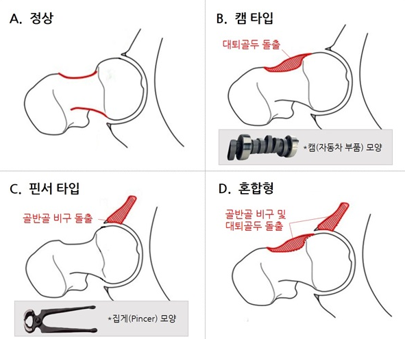 이러한 운동이나 동작에서 고관절의 굴곡(hip flexion)과 내회전(internal rotation)이 반복적으로 일어나면서, 대퇴골두와 비구(고관절을 이루는 뼈 구조) 사이에 비정상적인 마찰이 발생하여 연골이나 관절순(비구순)에 손상을 유발하게 됩니다. 특히, 젊고 활동적인 연령층에서 많이 발생하며, 운동량이 많거나 잘못된 자세로 반복되는 경우 위험이 커집니다.