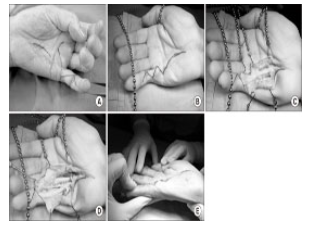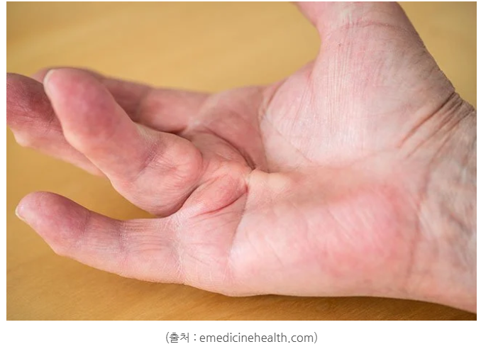 초기: 손바닥(특히 약지, 새끼손가락 부위)에 작은 덩어리(결절)나 함몰이 생김
