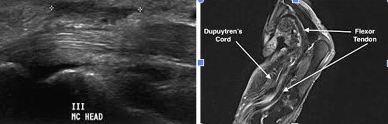 진행: 손바닥에서 손가락으로 이어지는 두꺼운 띠(줄)가 만져짐