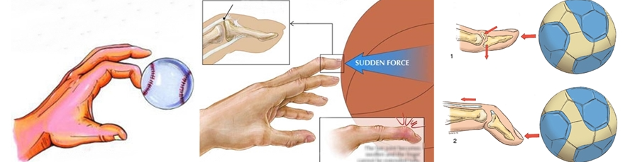 ♦ 운동 중 부상: 야구, 농구 등에서 공에 손가락 끝이 직접 맞아 강하게 꺾일 때 가장 흔하게 발생합니다.