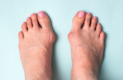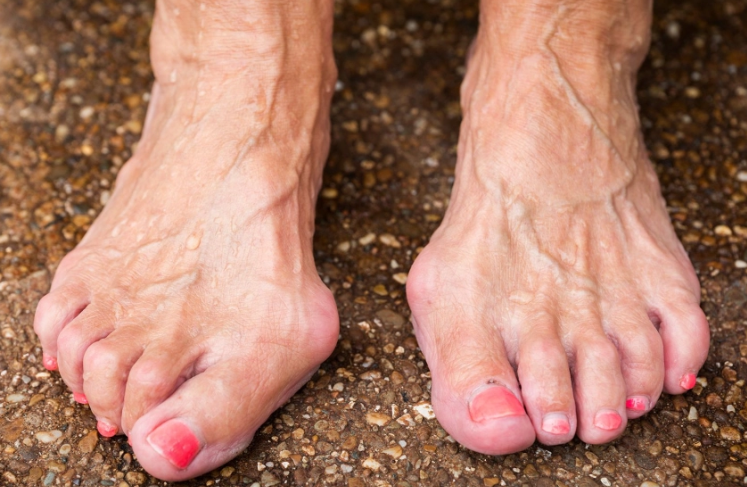 발의 변형과 보행 불균형: 심하면 엄지발가락이 둘째발가락 위로 올라가거나 넘는 경우