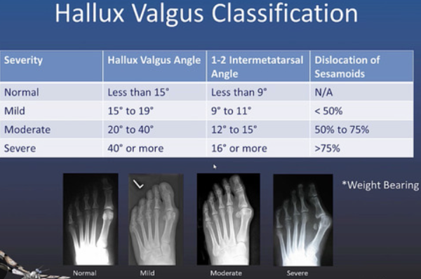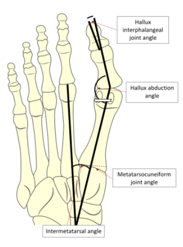 정상인의 무지외반각은 15도 이하, 20~40도는 중등도, 40도 이상은 중증으로 구분