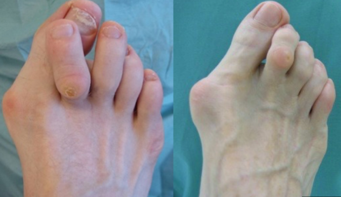 ♦ 뼈 절골술(뼈 자르기 및 배열 교정): 변형된 뼈를 잘라내거나 교정하여 엄지발가락을 바른 위치로 재정렬합니다.