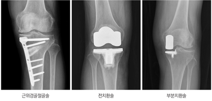 인공관절 수술: 연골이 거의 남지 않고 보존적 치료에 반응이 없는 경우 시행. 최근 로봇 인공관절도 도입 중.