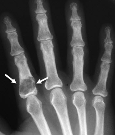긴 뼈(상완골, 대퇴골)에 발생한 경우 골절 없이 통증이 있으면 악성 변화를 의심합니다.