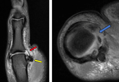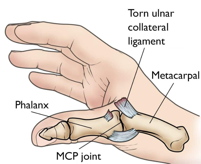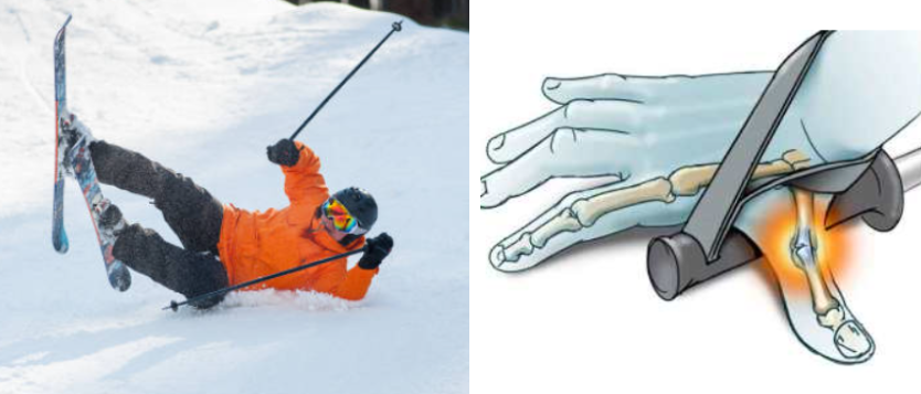급성 외상: 특히 스키어처럼 넘어지면서 엄지가 과도하게 벌어져 MCP 관절의 척측측부인대에 강한 측부 외력이 가해질 때(예: 스키 폴을 잡고 넘어질 때 Skier’s thumb) 발생