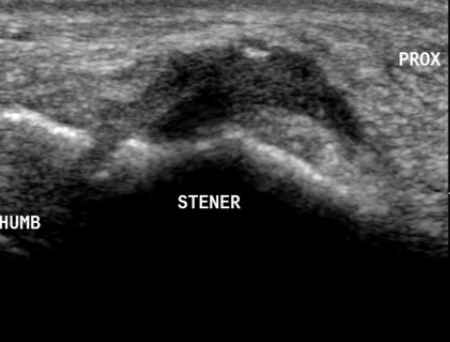 심한 경우, 인대가 파열되어 피부 아래 덩어리처럼 만져지는 "Stener 병변"이 동반되기도 함.