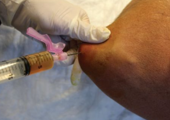 팔꿈치에 물이 심하게 찬 경우, 주사기로 점액을 빼냅니다. 이 과정에서 감염 여부를 확인하기 위해 검사도 시행할 수 있습니다.