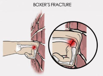 복서 골절(Boxer's fracture)은 주먹 쥔 손으로 딱딱한 물체(벽, 펀치볼 등)를 가격할 때 주로 발생하는 손의 다섯 번째 중수골(새끼손가락 쪽) 경부의 골절입니다. 이름은 '복서(권투 선수)"에서 따왔으나 실제 권투 선수보다는 일반 젊은 남성들에게서 분노나 실수로 벽을 치다가 자주 발견됩니다.