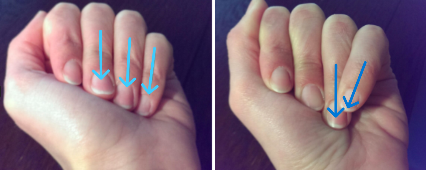 주먹을 쥐었을 때 새끼손가락 너클이 들어가거나 내려앉아 보임