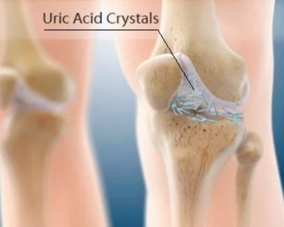 통풍: 요산 결정이 무릎에 쌓여 염증과 관절액 축적을 유발할 수 있습니다.