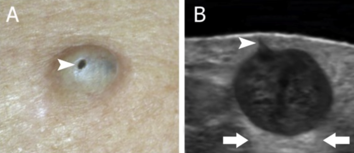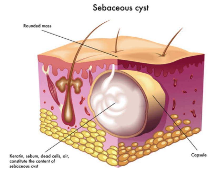 내부에는 케라틴(각질)과 피지 등으로 이루어진 치즈처럼 부드럽고, 누르면 악취가 나는 내용물이 차 있습니다.