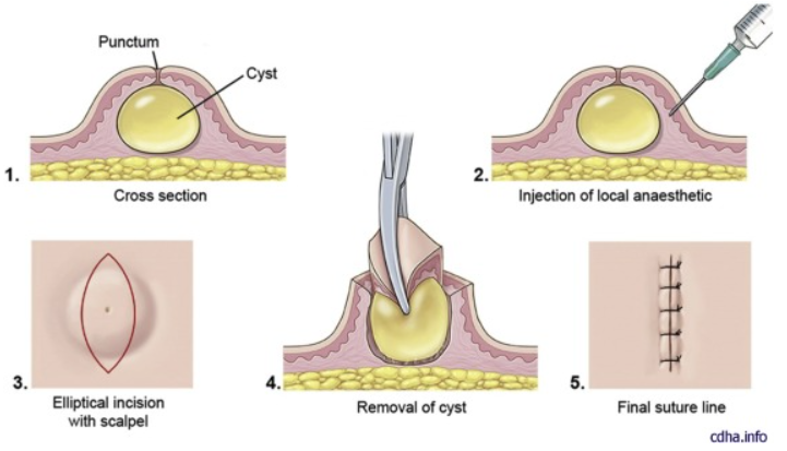 크기가 커지거나 염증·감염이 동반된 경우, 외과적 절제(수술)로 낭종과 주머니 벽을 완전 제거하는 것이 재발 방지에 가장 효과적입니다.