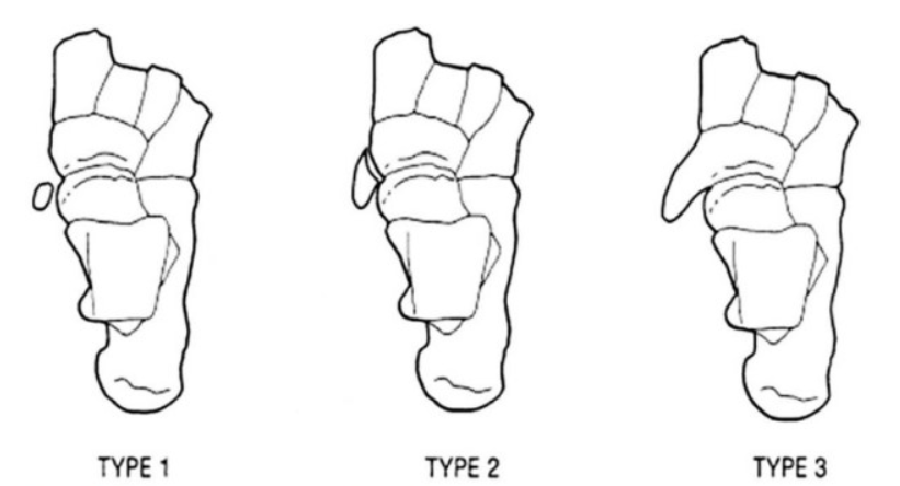 제3형 | 부주상골이 주상골의 일부로 융합되어 뼈가 크게 형성된 경우 | 경미한 증상이나 드물게 부주상골에 의한 문제가능 |