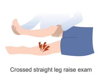 교차 직거상 검사(Crossed SLR Test): 증상이 있는 반대쪽 다리를 들어 올렸을 때 통증이 발생하면 디스크 탈출 가능성이 더 높습니다.