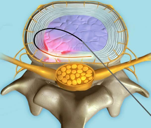 바늘을 디스크 내 삽입해 고주파 열로 디스크 섬유륜 열치료 시행함.
