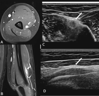 신경이 상완골 나선형 홈 부위에서 눌리면서 신경 기능이 저하됩니다.
