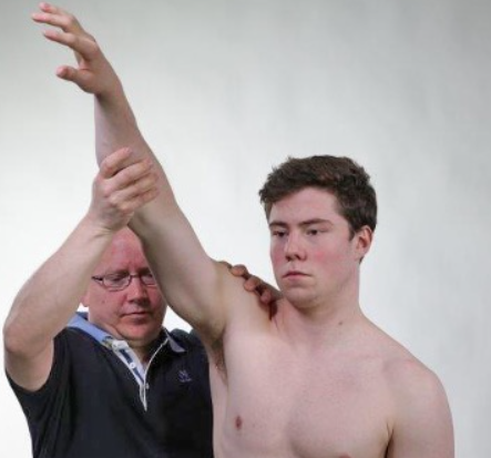 네어 테스트 (Neer test): 환자의 팔을 최대한 위로 들어 올려 견봉과 회전근개 사이 공간이 좁아져 통증 유발 확인.