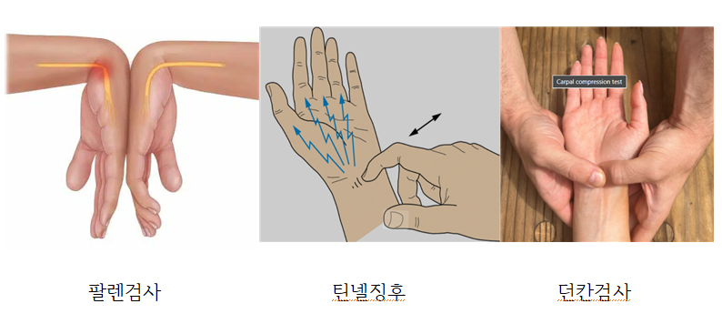병력 청취 및 신체검사: 저명한 위치의 감각저하, 팔렌 검사, 틴넬 징후, 던칸 검사